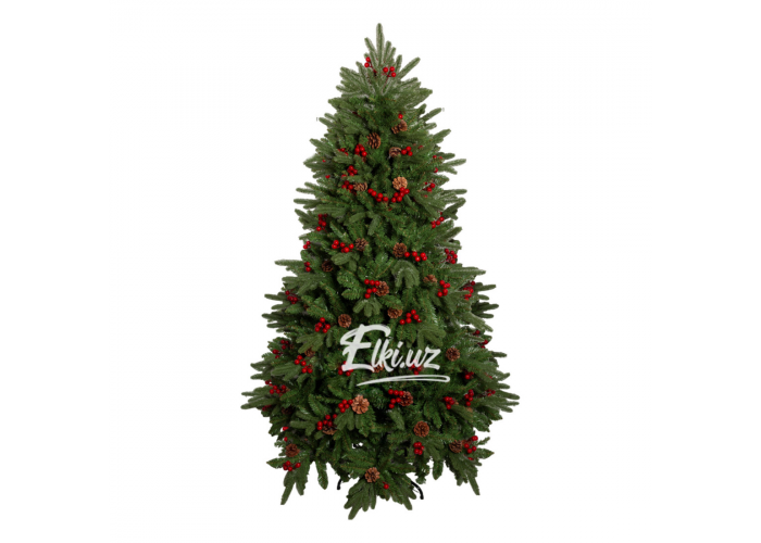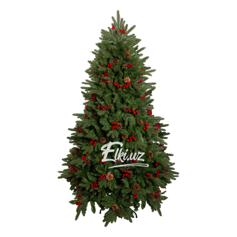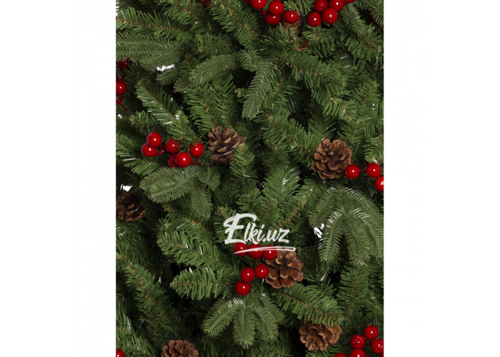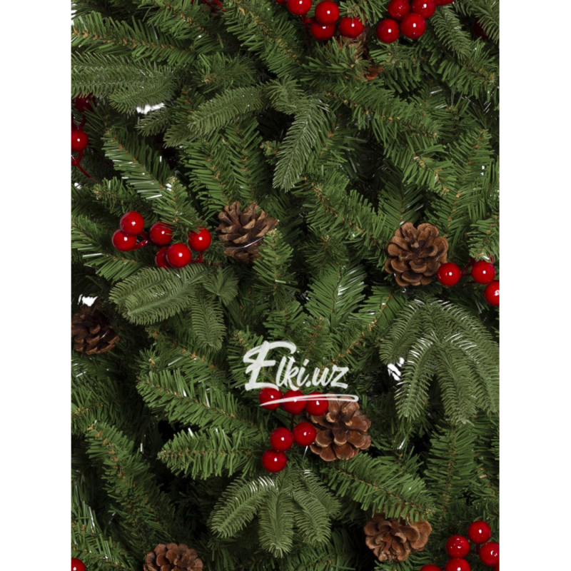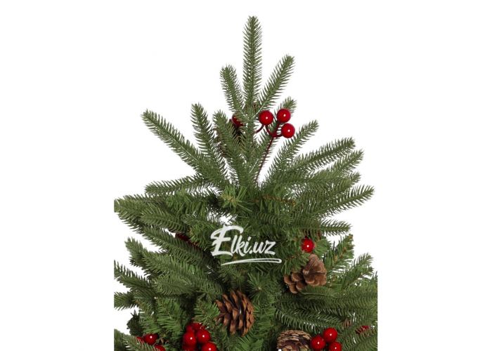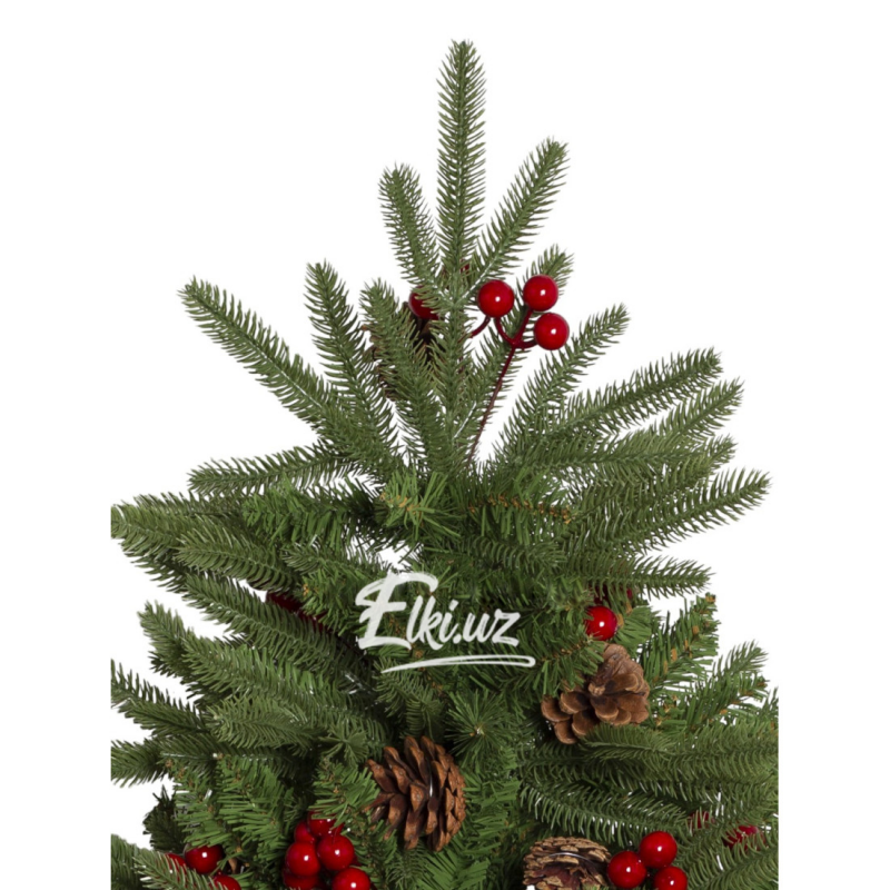 Особую выразительность дереву придают натуральные шишки и декоративные ягоды насыщенно-красного цвета. Этот декор равномерно распределён по ветвям, придавая ели праздничность и живость. Елка прекрасно смотрится как без дополнительных украшений, так и в сочетании с гирляндами и игрушками.