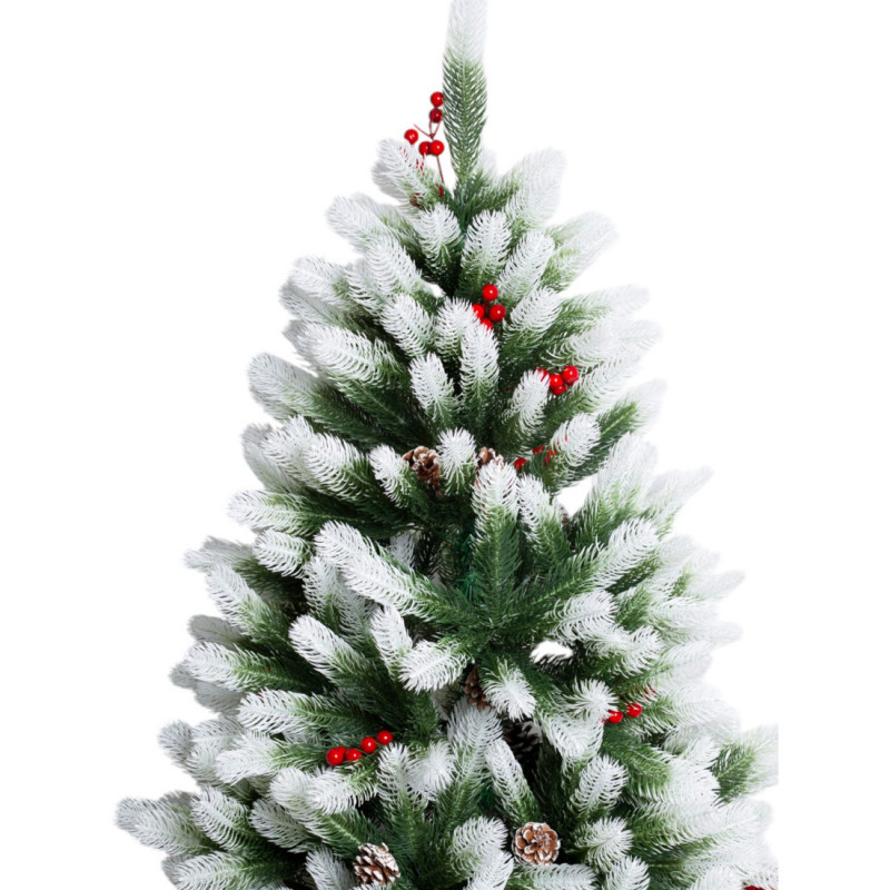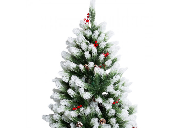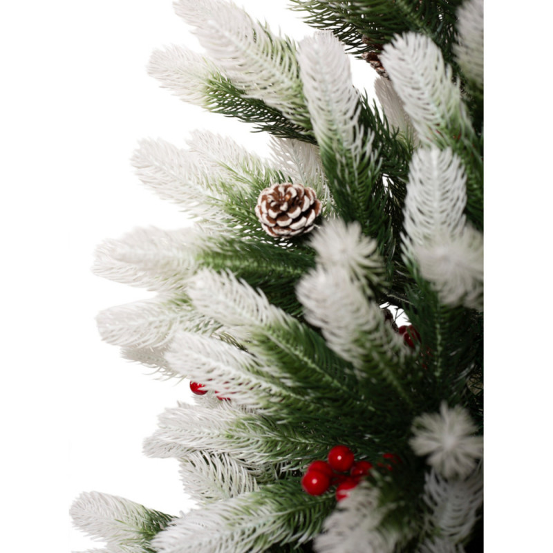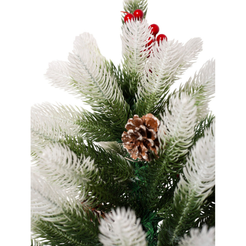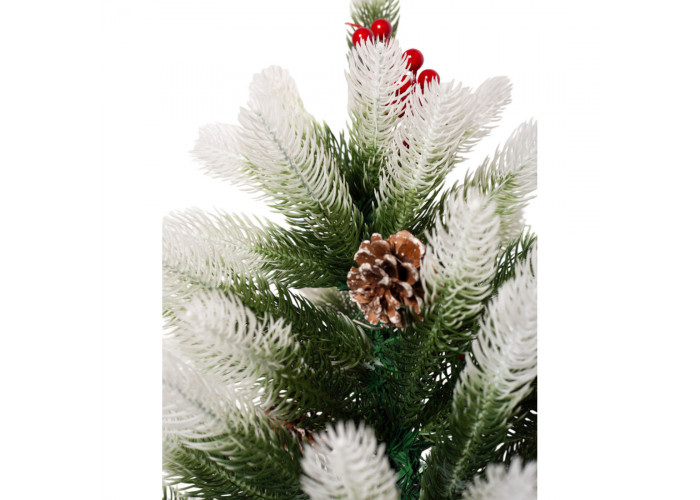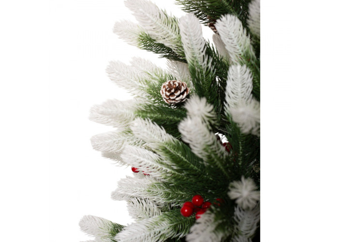 Дизайн продуман до мелочей: кончики веток покрыты лёгким инеем, словно дерево только что перенесли из заснеженного леса. Этот эффект придаёт ёлке свежесть и зимний шарм. Дополнением служат натуральные шишки и аккуратные искусственные ягоды насыщенно-красного цвета, создающие праздничное настроение и гармонию в композиции.